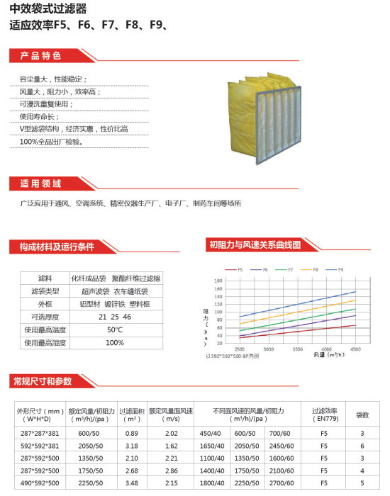 結(jié)構(gòu)緊湊,輕便 中效袋式過濾器的框架可選用鍍鋅鋼、鋁合金,再輔以濾袋支撐鐵骨架,既有效支撐了濾袋,又可最大限度的增加過濾面積,整體緊湊,堅(jiān)固,易于安裝、拆卸。 優(yōu)質(zhì)的多層聚酯濾料,高容塵,低阻力 采用優(yōu)質(zhì)蓬松的多層聚酯合成纖維,其進(jìn)風(fēng)面蓬松, 出風(fēng)面緊實(shí),在保證效率的同時,提供了較大的容塵量。 合理的設(shè)置了濾袋數(shù)量,增加了過濾面積及容塵量,同時降低了阻力。